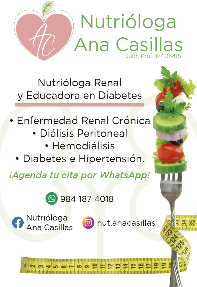 Conocida por su experiencia en nutrición renal, Nut. Casillas posee un profundo conocimiento sobre las necesidades dietéticas específicas de los pacientes con problemas renales. Su enfoque se basa en proporcionar pautas nutricionales personalizadas que ayuden a mejorar la función renal y a mantener un equilibrio adecuado de nutrientes en el cuerpo.